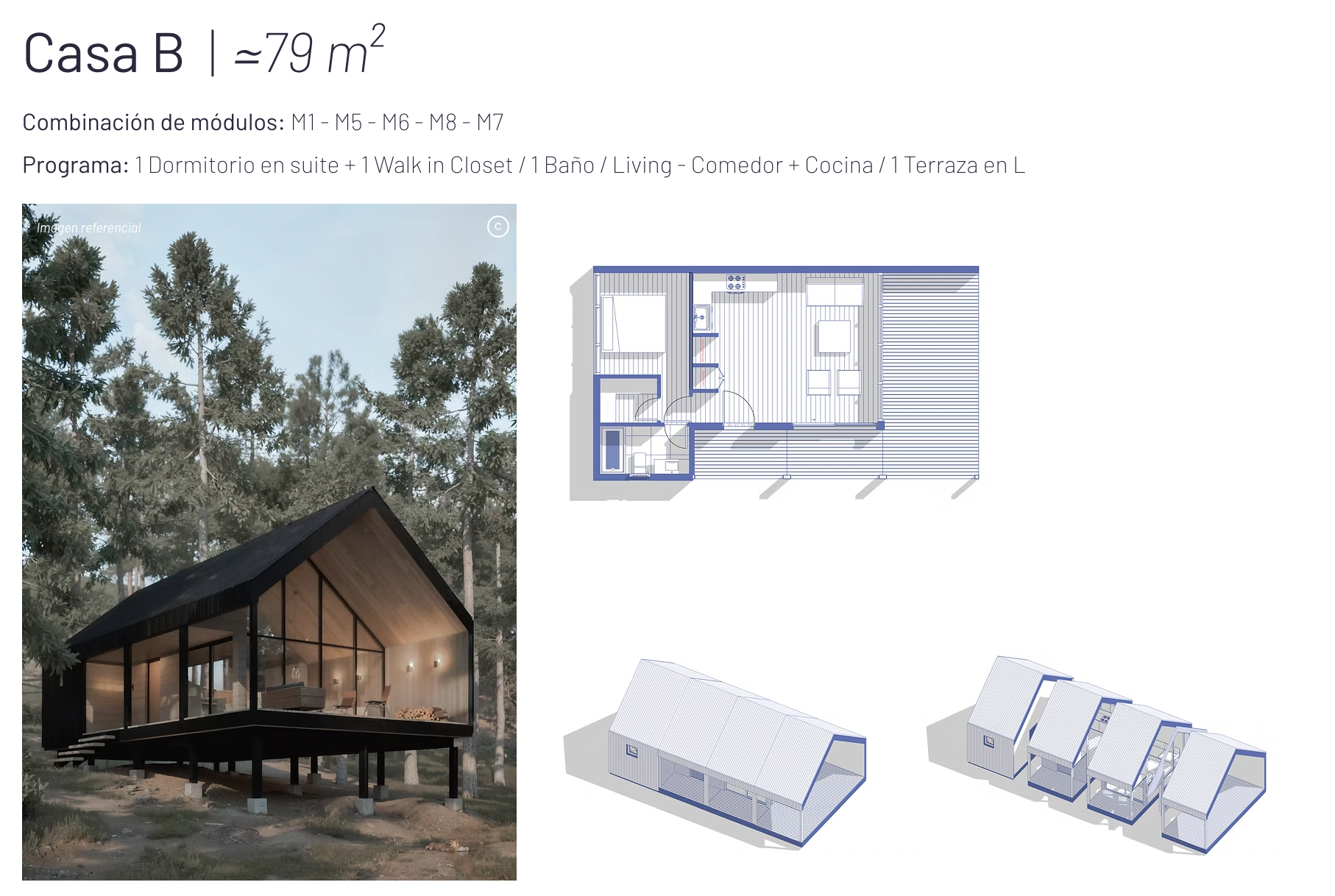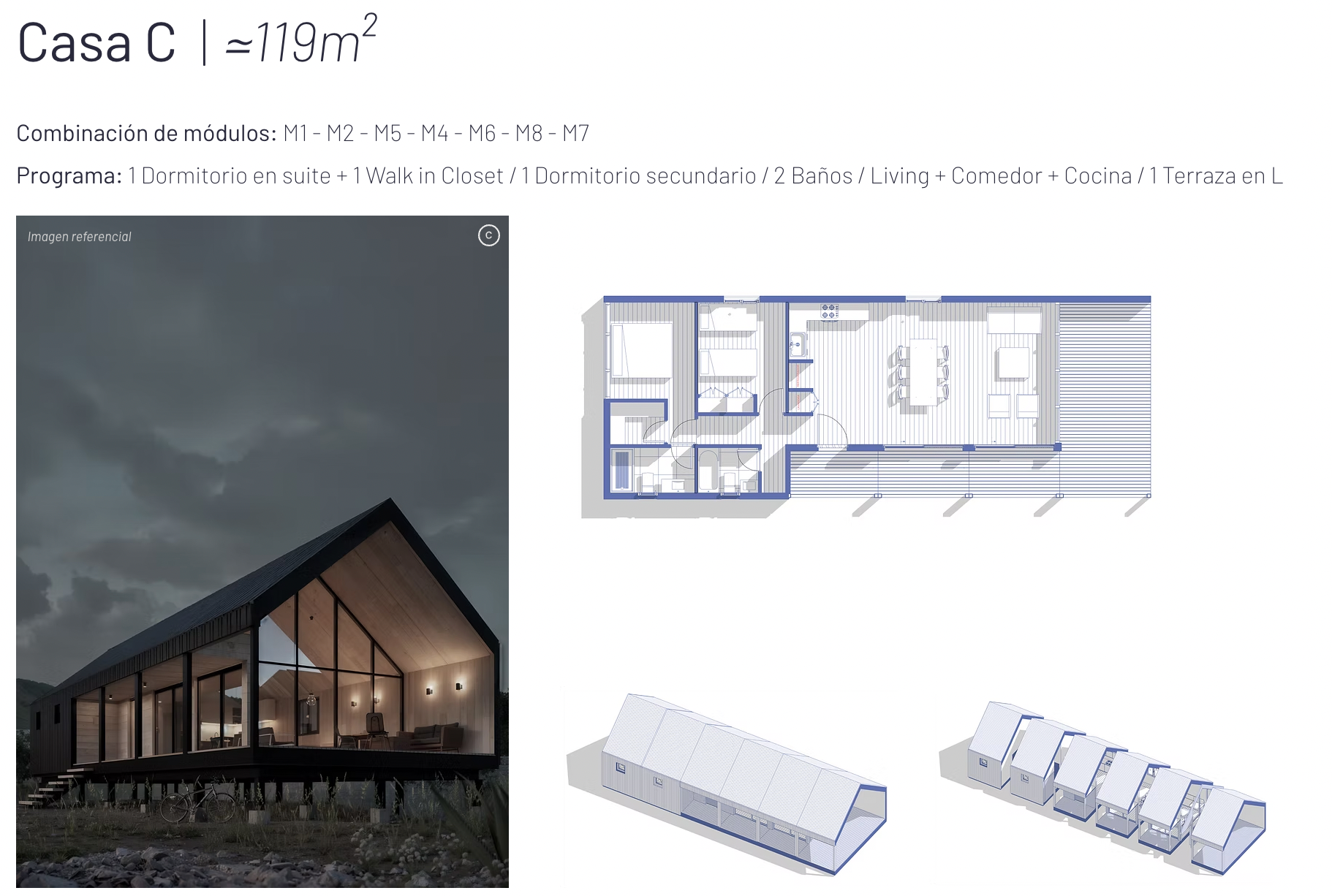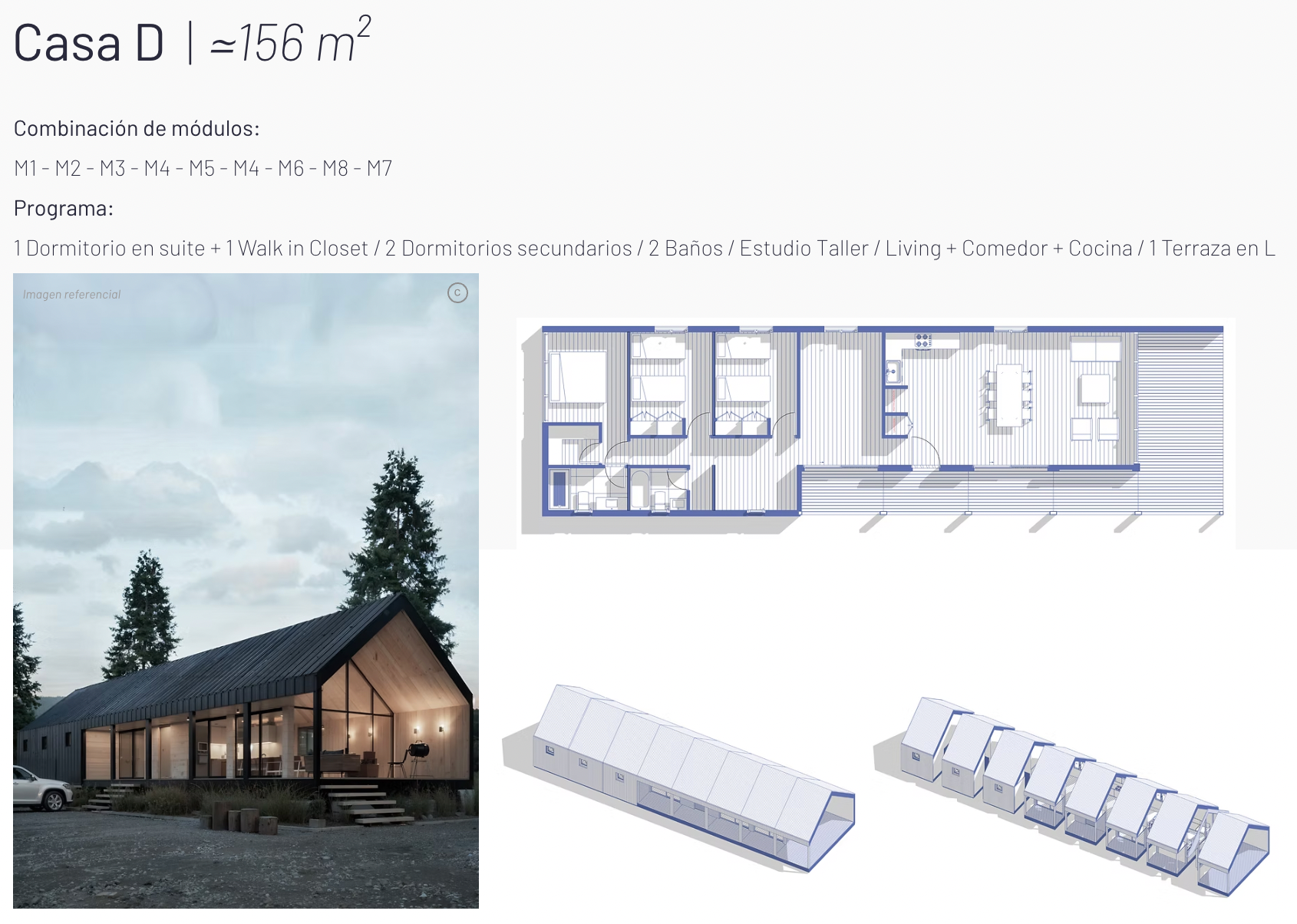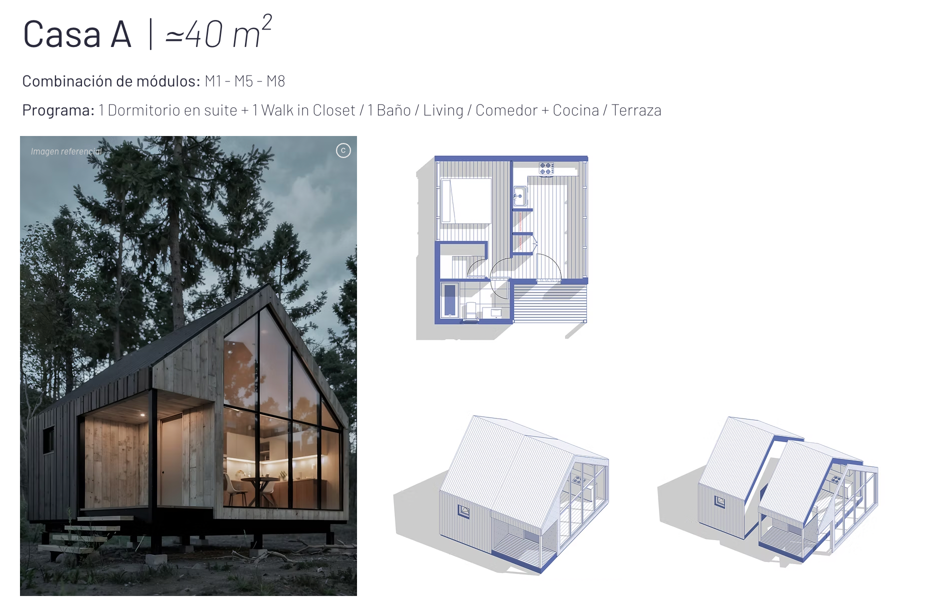 Hoy ofrecen cuatro modelos de casas que van desde los 40m2 hasta los 156m2, y además, entregan la posibilidad de que diseñes tu casa pudiendo elegir entre ocho módulos que tienen disponibles: