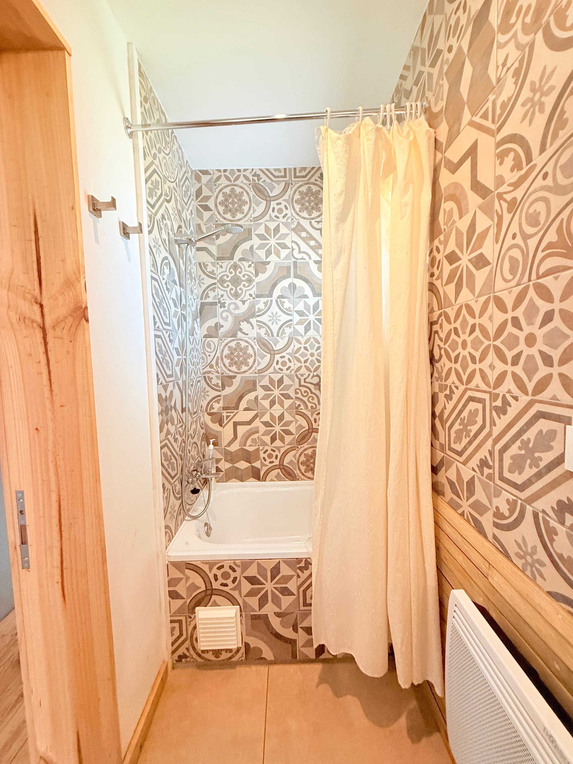 - Luego, al continuar por el pasillo, aparecen dos dormitorios que comparten un baño con tina pequeña.