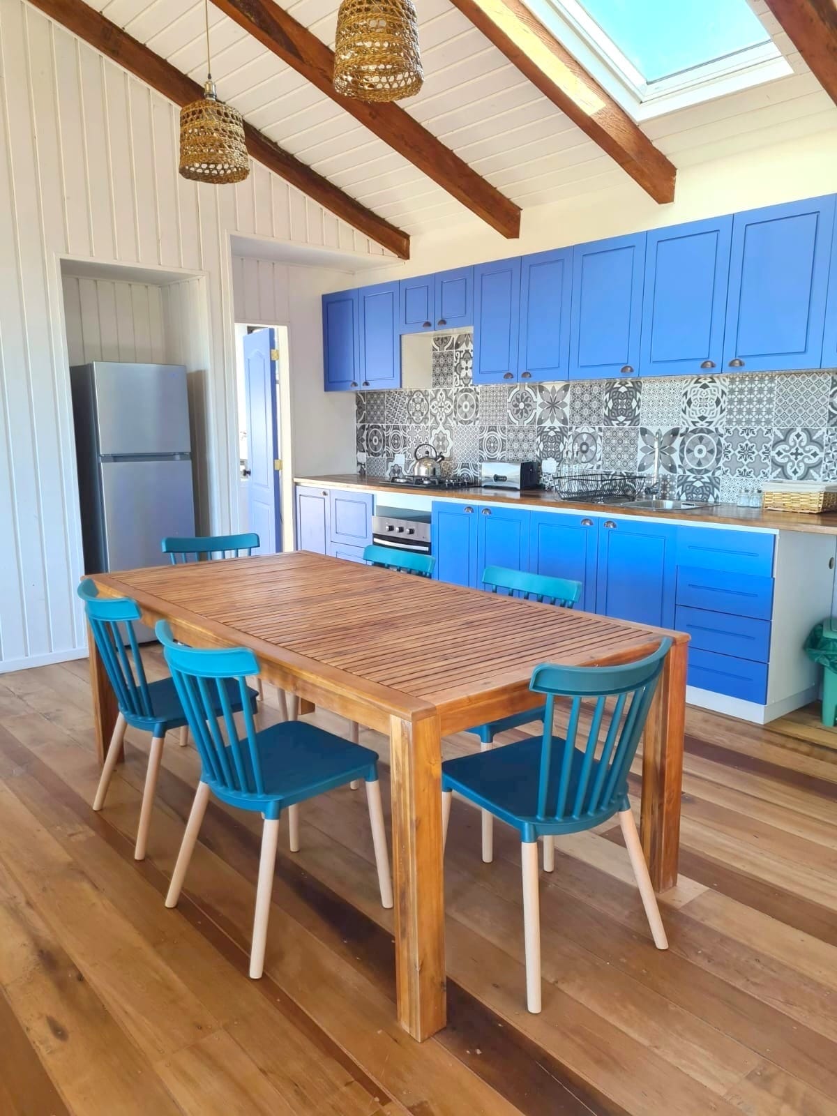 - La casa tiene tres dormitorios, dos baños y un gran living comedor con cocina integrada. Con un amplio hall de entrada, loggia y terraza techada.
