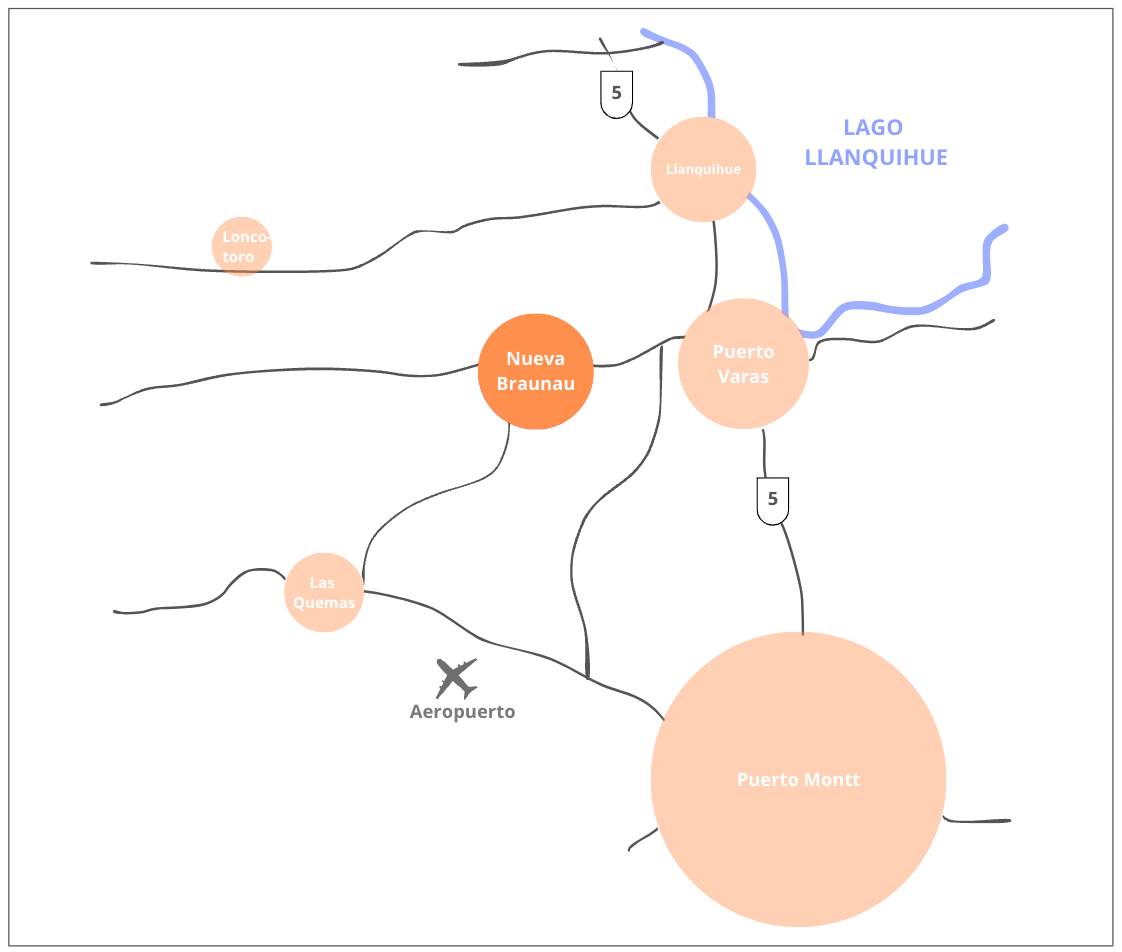 Nueva Braunau es una zona que está en pleno crecimiento, con una belleza natural de bosques, ríos y campos. Está muy bien conectado con otras localidades cercanas y se vive como un ambiente rural cercano a una ciudad grande como lo es Puerto Varas.