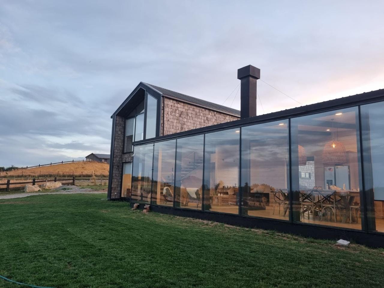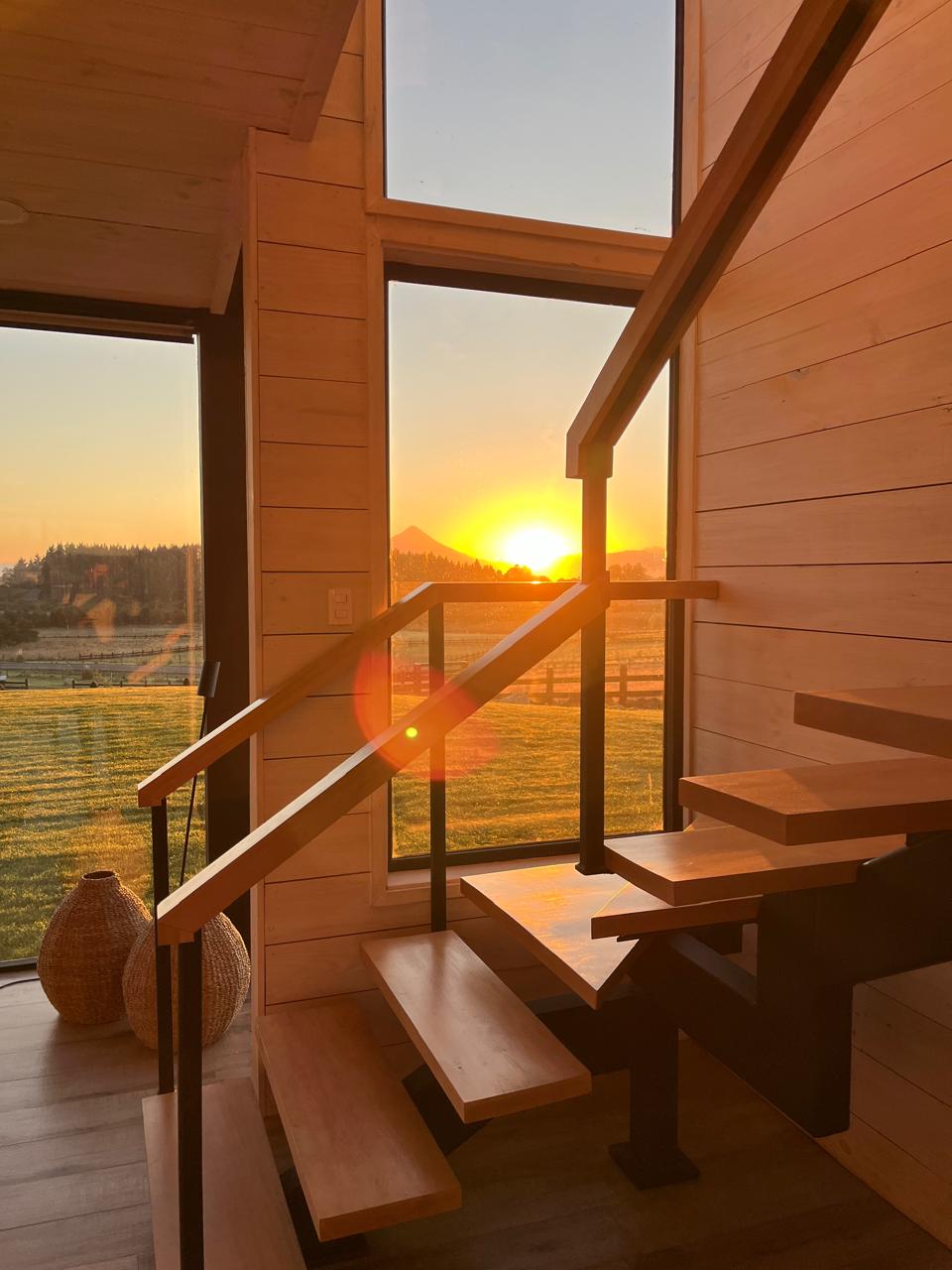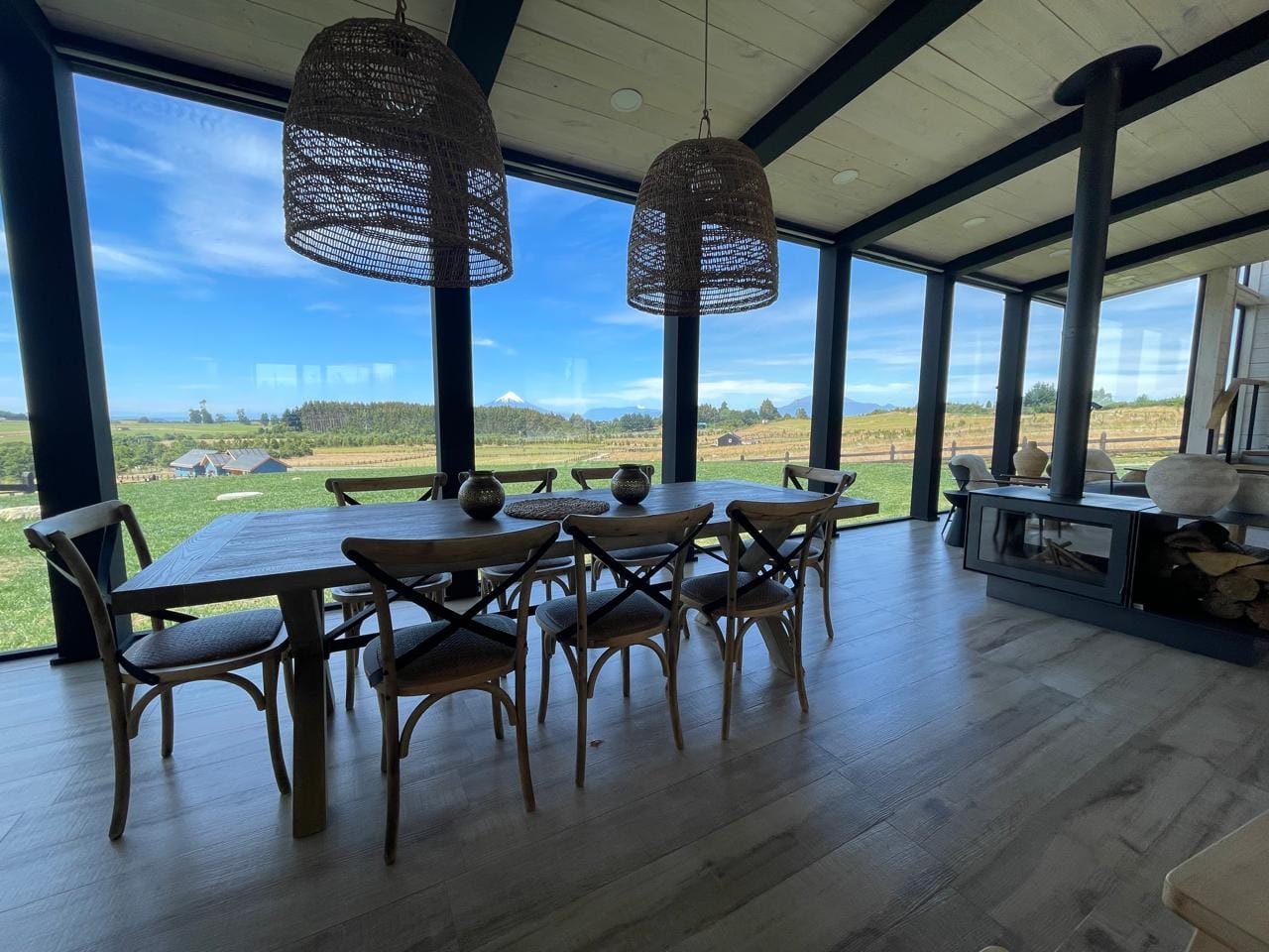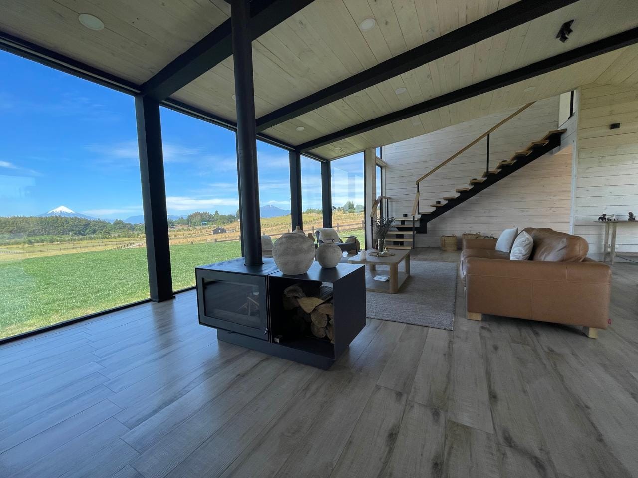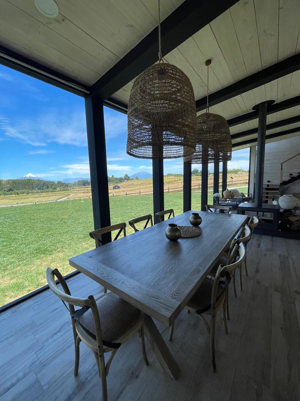 Esta propiedad, inspirada en los antiguos galpones del sur, combina amplitud y diseño contemporáneo bajo una arquitectura elegante y sencilla a la vez. Sus líneas limpias, techos altos y grandes ventanales enmarcan la vista abierta a los volcanes, dejando que la luz natural sea protagonista durante todo el día.