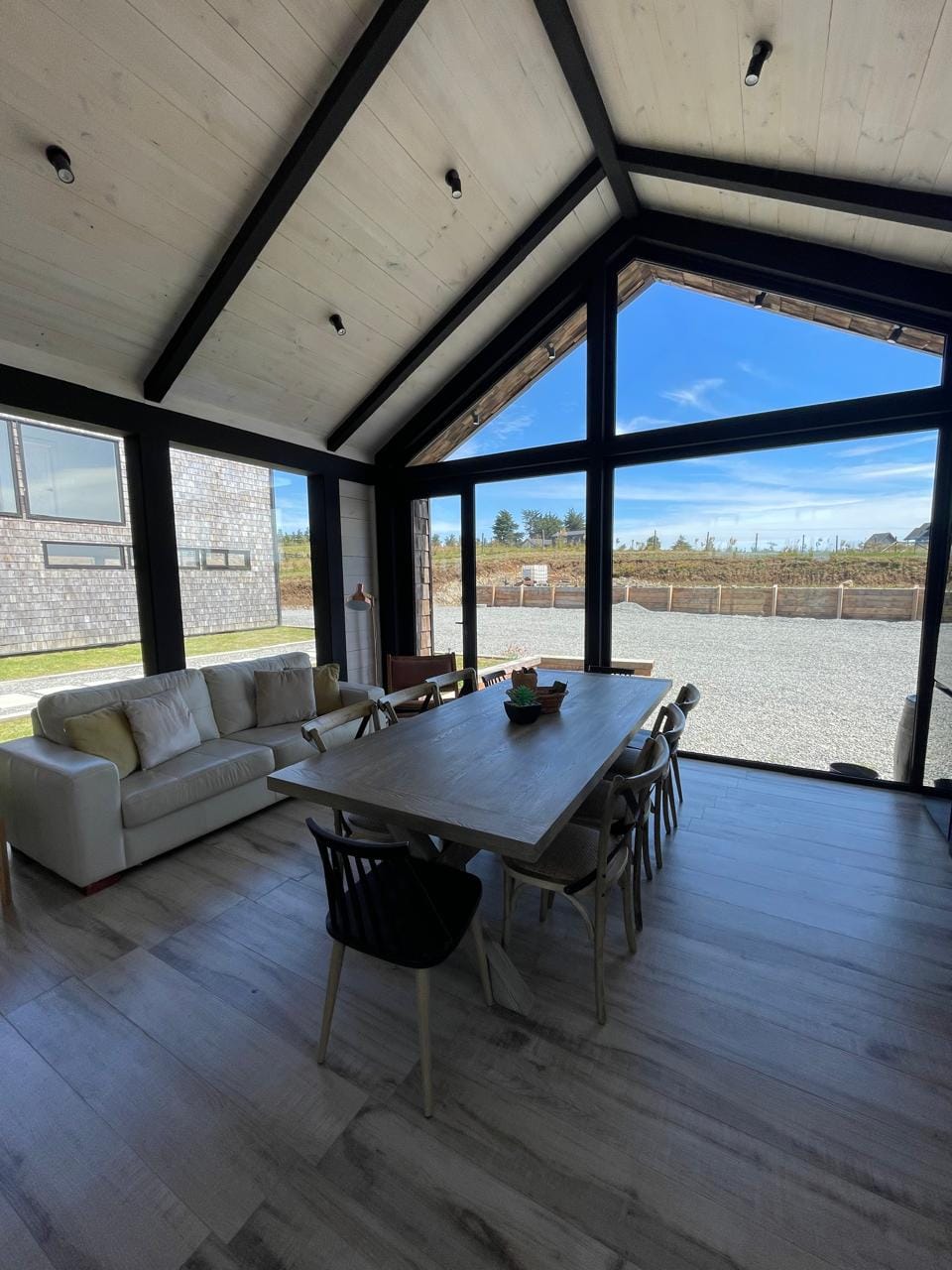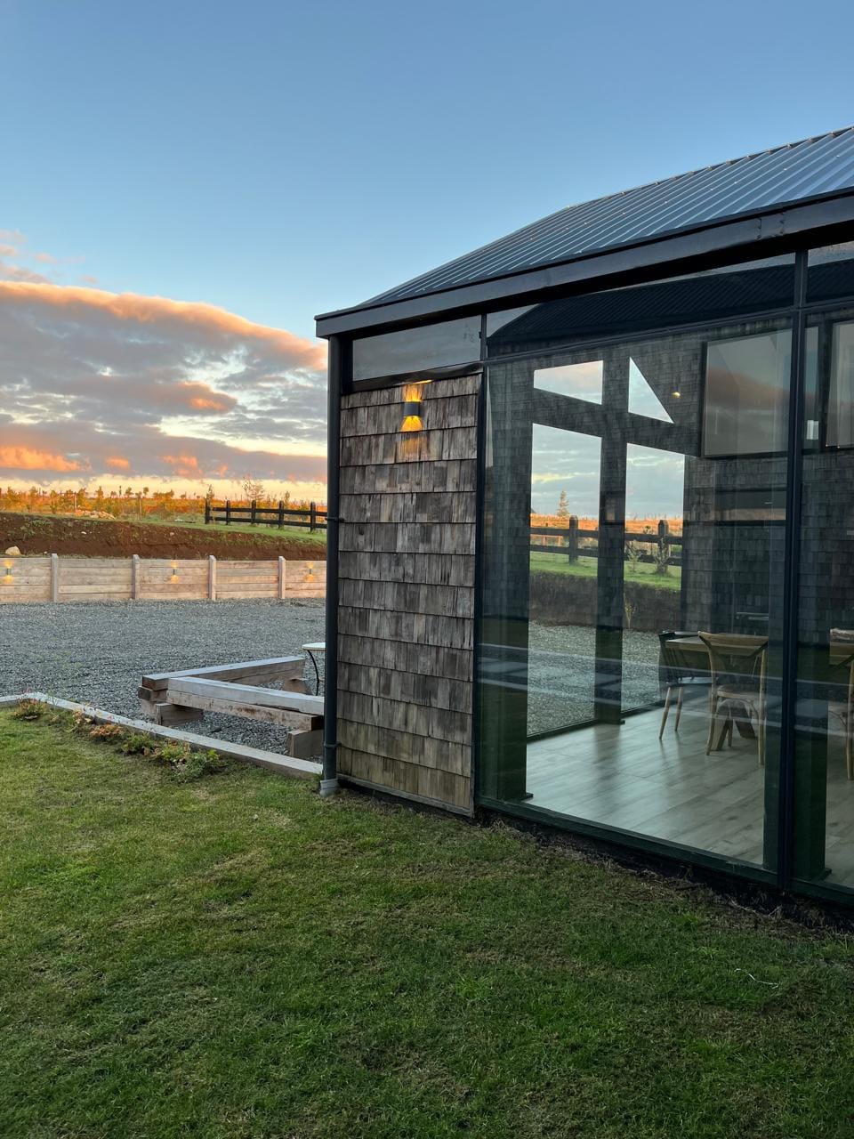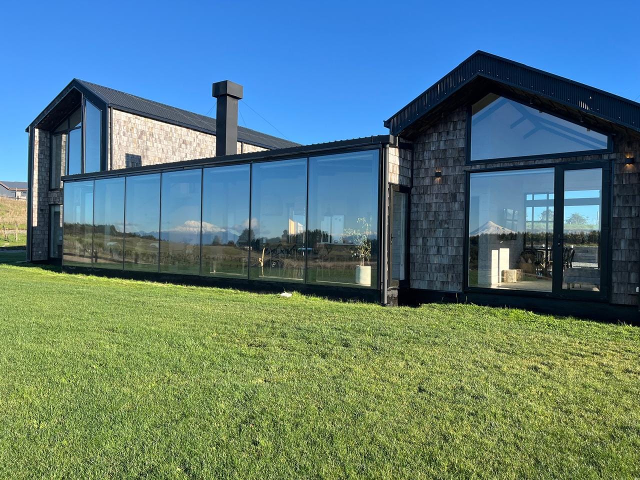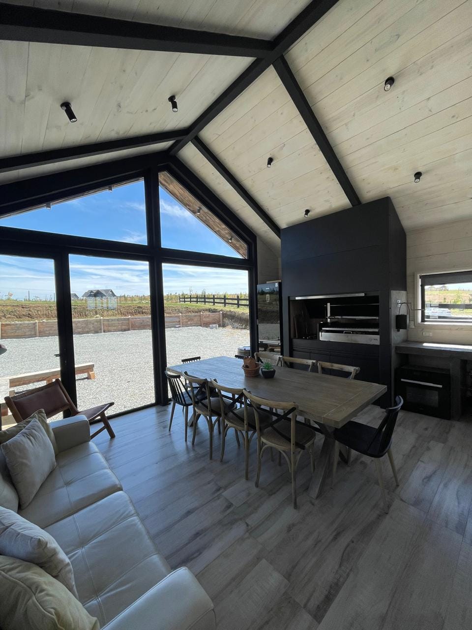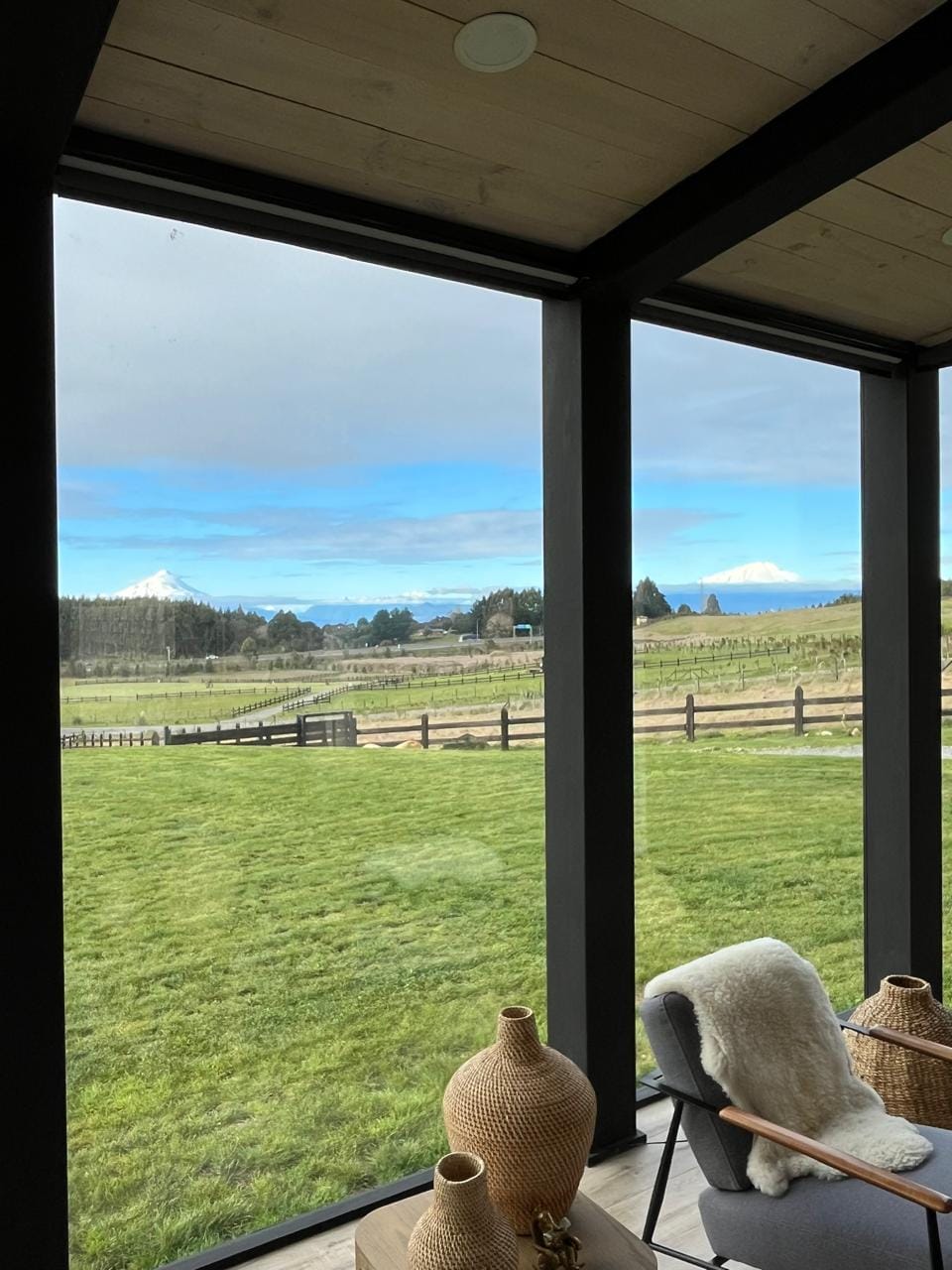 Esta propiedad, inspirada en los antiguos galpones del sur, combina amplitud y diseño contemporáneo bajo una arquitectura elegante y sencilla a la vez. Sus líneas limpias, techos altos y grandes ventanales enmarcan la vista abierta a los volcanes, dejando que la luz natural sea protagonista durante todo el día.