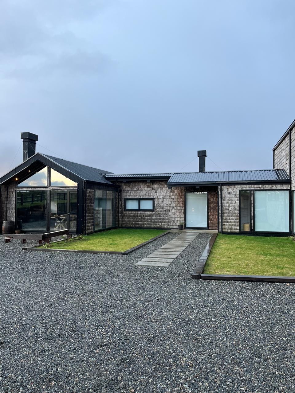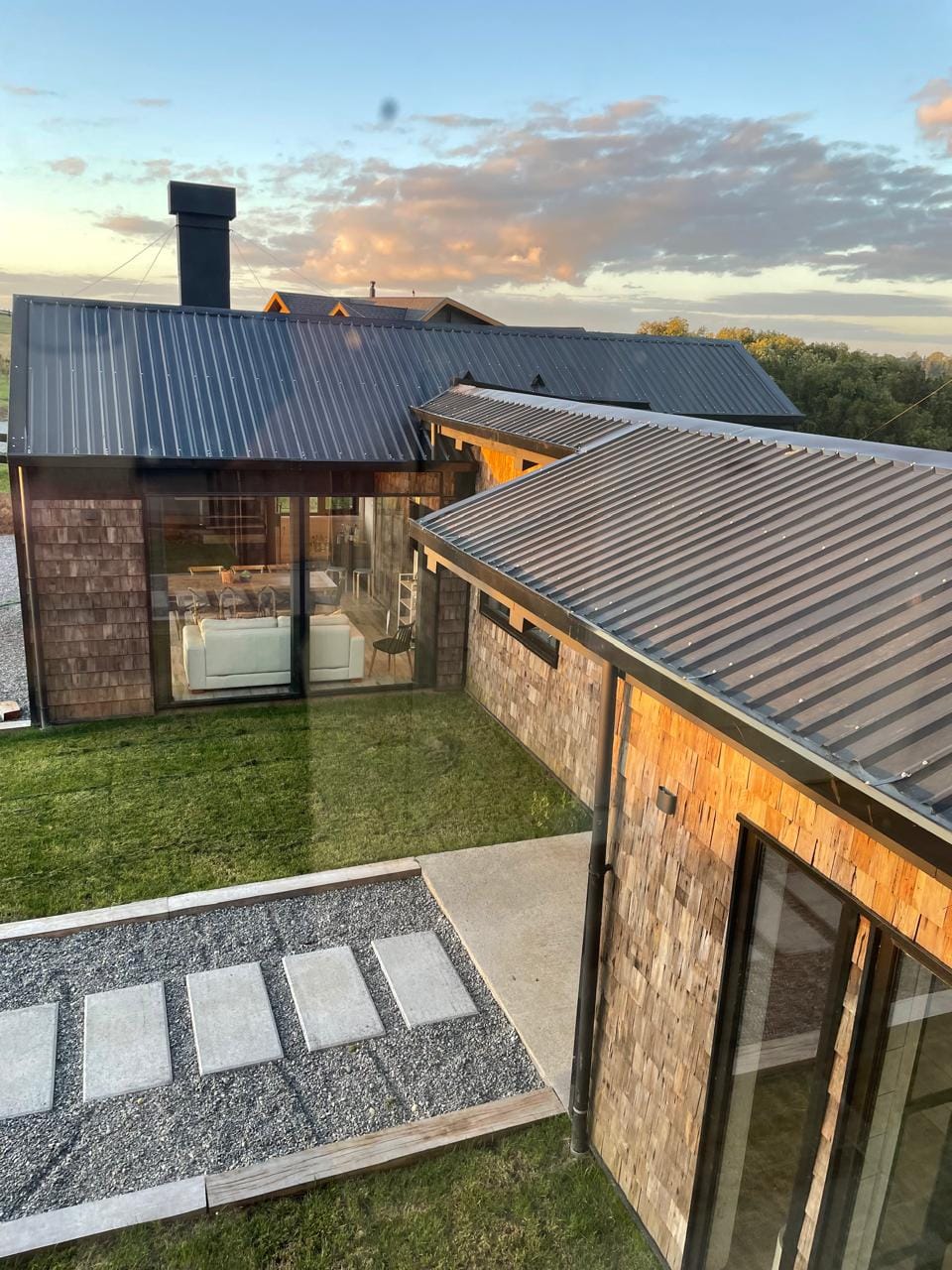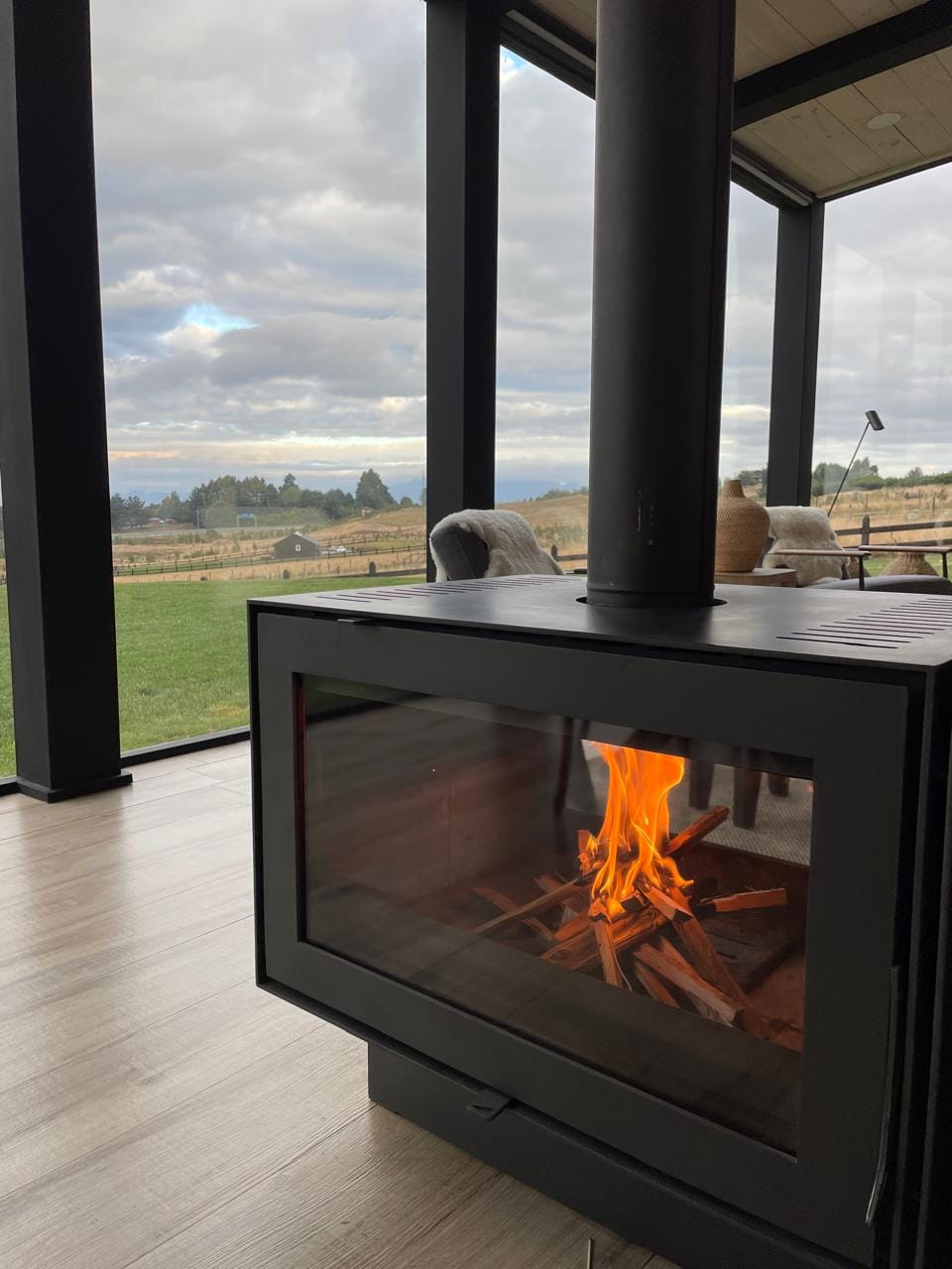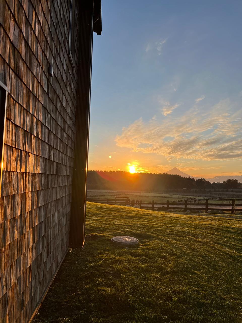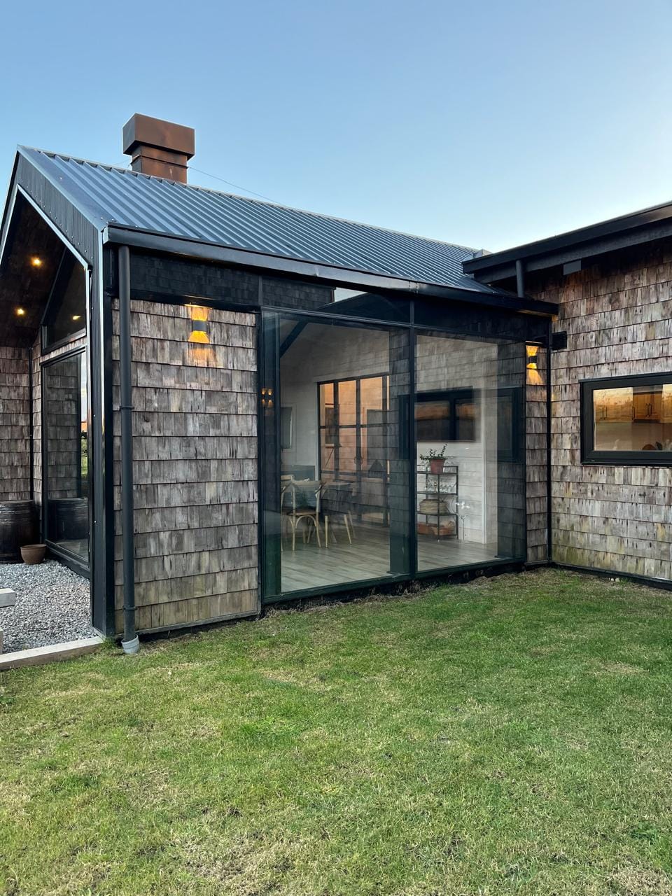 Esta propiedad, inspirada en los antiguos galpones del sur, combina amplitud y diseño contemporáneo bajo una arquitectura elegante y sencilla a la vez. Sus líneas limpias, techos altos y grandes ventanales enmarcan la vista abierta a los volcanes, dejando que la luz natural sea protagonista durante todo el día.