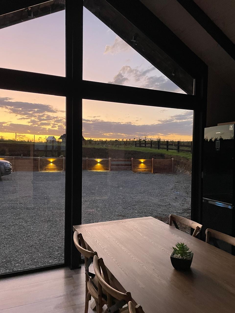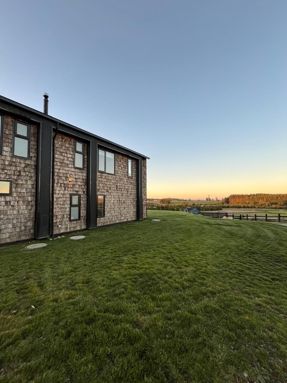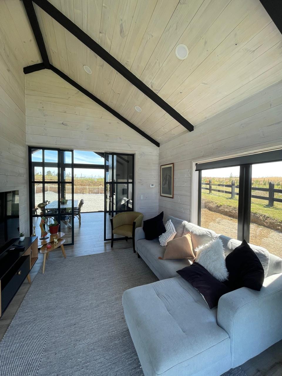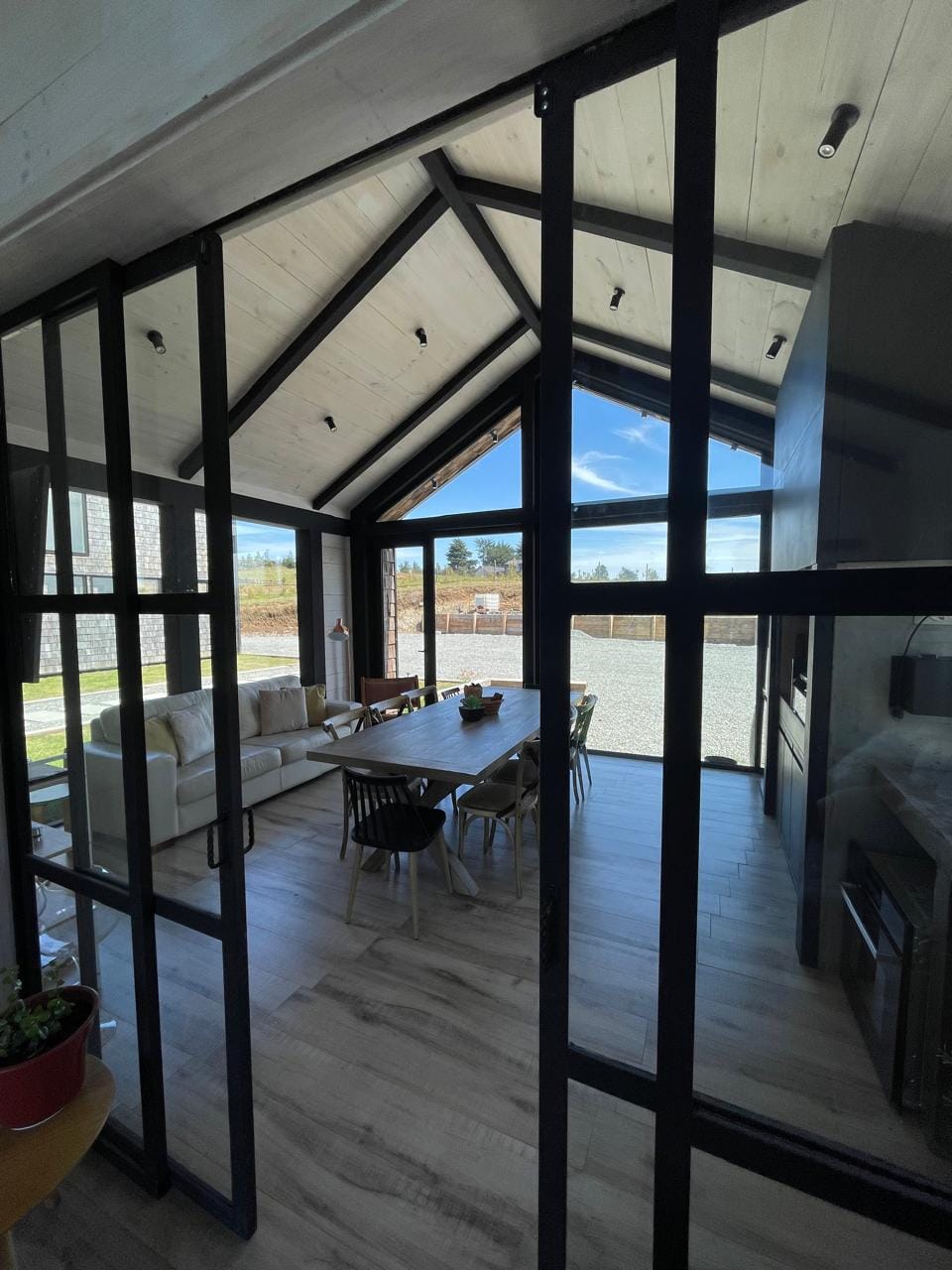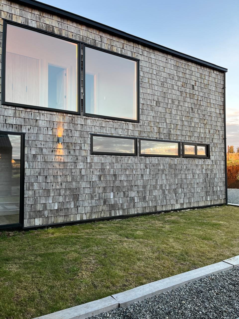 Esta propiedad, inspirada en los antiguos galpones del sur, combina amplitud y diseño contemporáneo bajo una arquitectura elegante y sencilla a la vez. Sus líneas limpias, techos altos y grandes ventanales enmarcan la vista abierta a los volcanes, dejando que la luz natural sea protagonista durante todo el día.