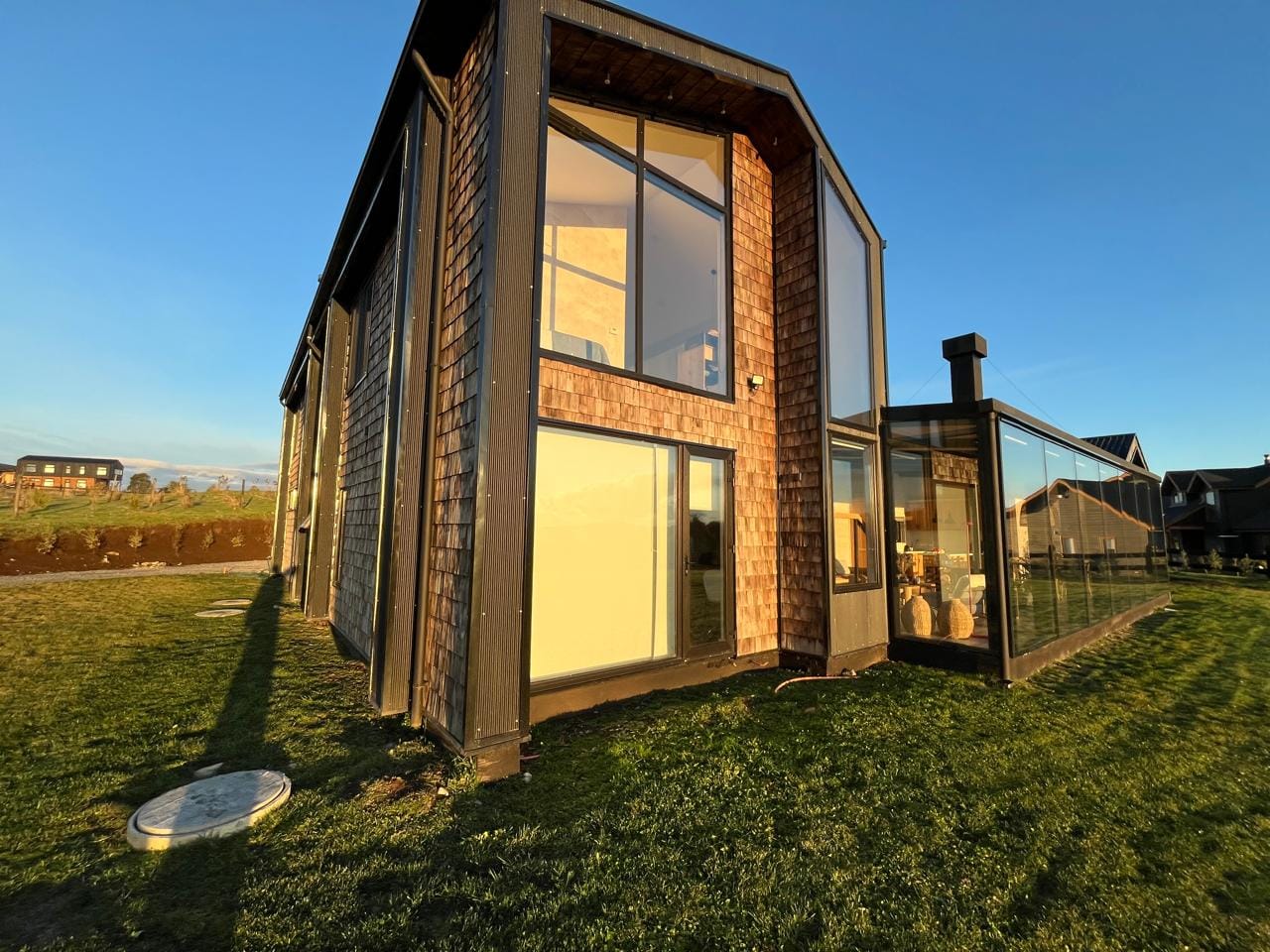 Esta propiedad, inspirada en los antiguos galpones del sur, combina amplitud y diseño contemporáneo bajo una arquitectura elegante y sencilla a la vez. Sus líneas limpias, techos altos y grandes ventanales enmarcan la vista abierta a los volcanes, dejando que la luz natural sea protagonista durante todo el día.