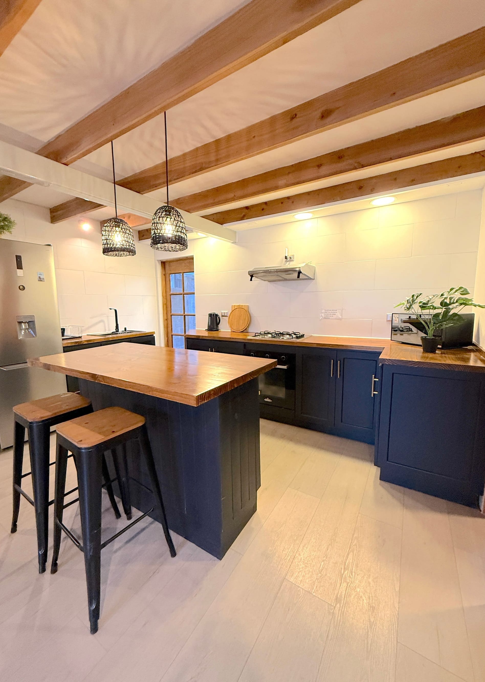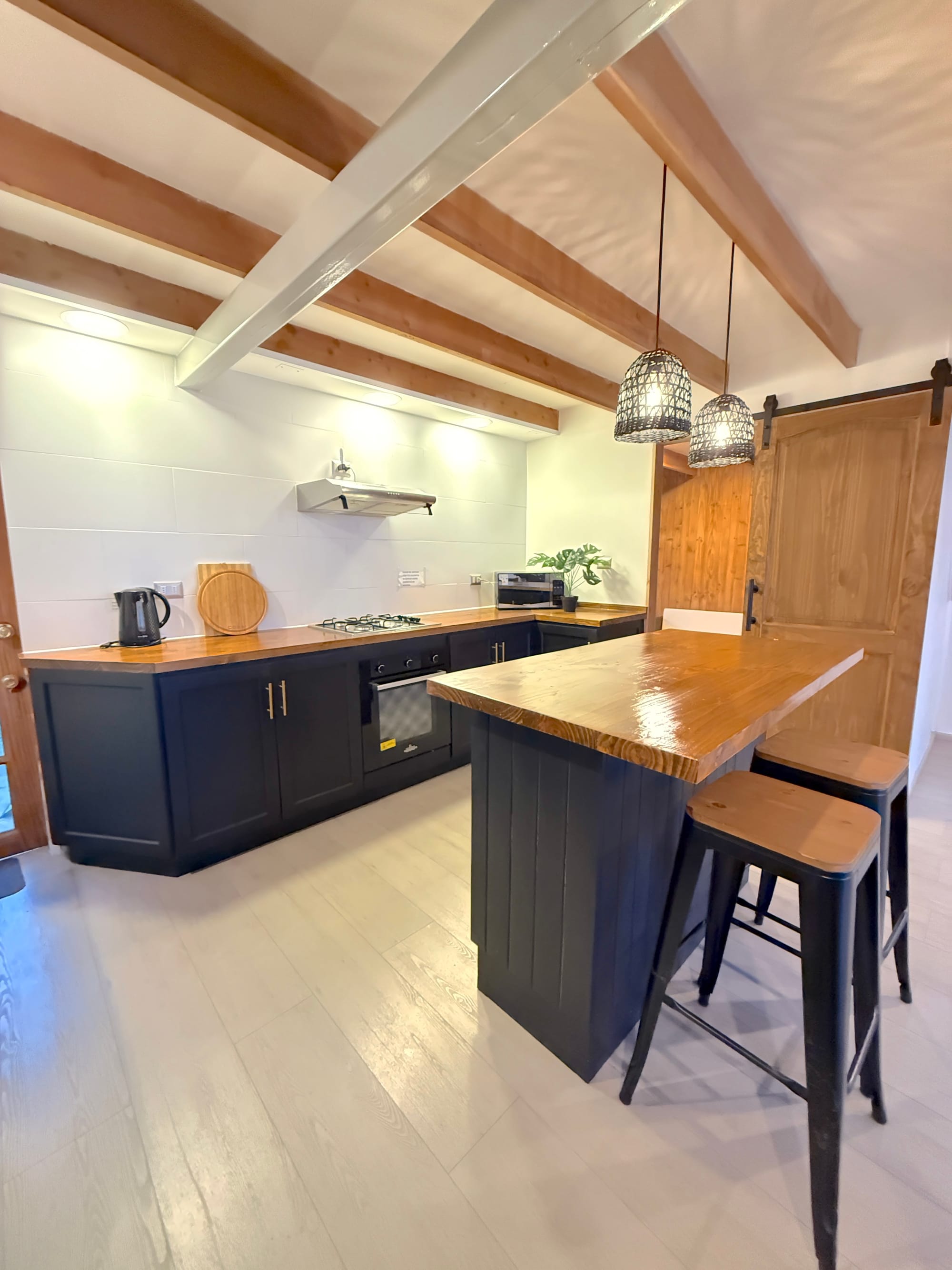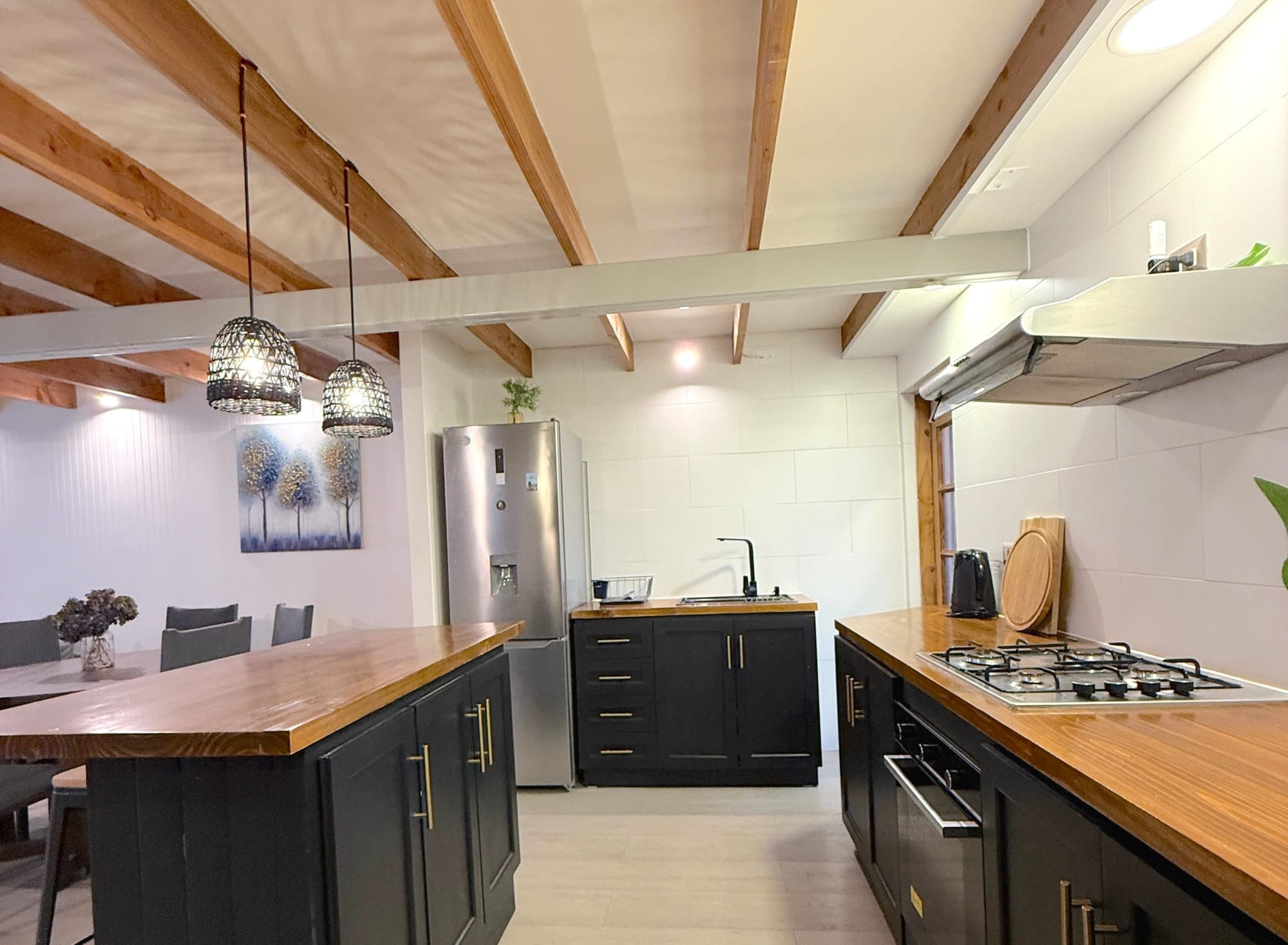 - La cocina está equipada con horno eléctrico, cocina y campana.