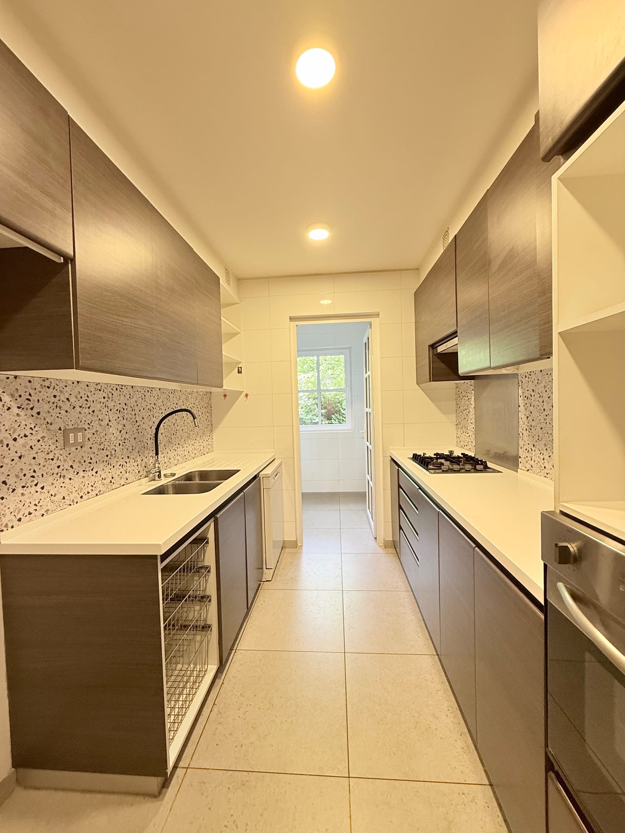 - Luego, desde el hall nos encontramos con una cocina independiente con logia, y por otro sector, con una pieza con baño que puede funcionar como pieza de visitas, sala de juegos o escritorio.