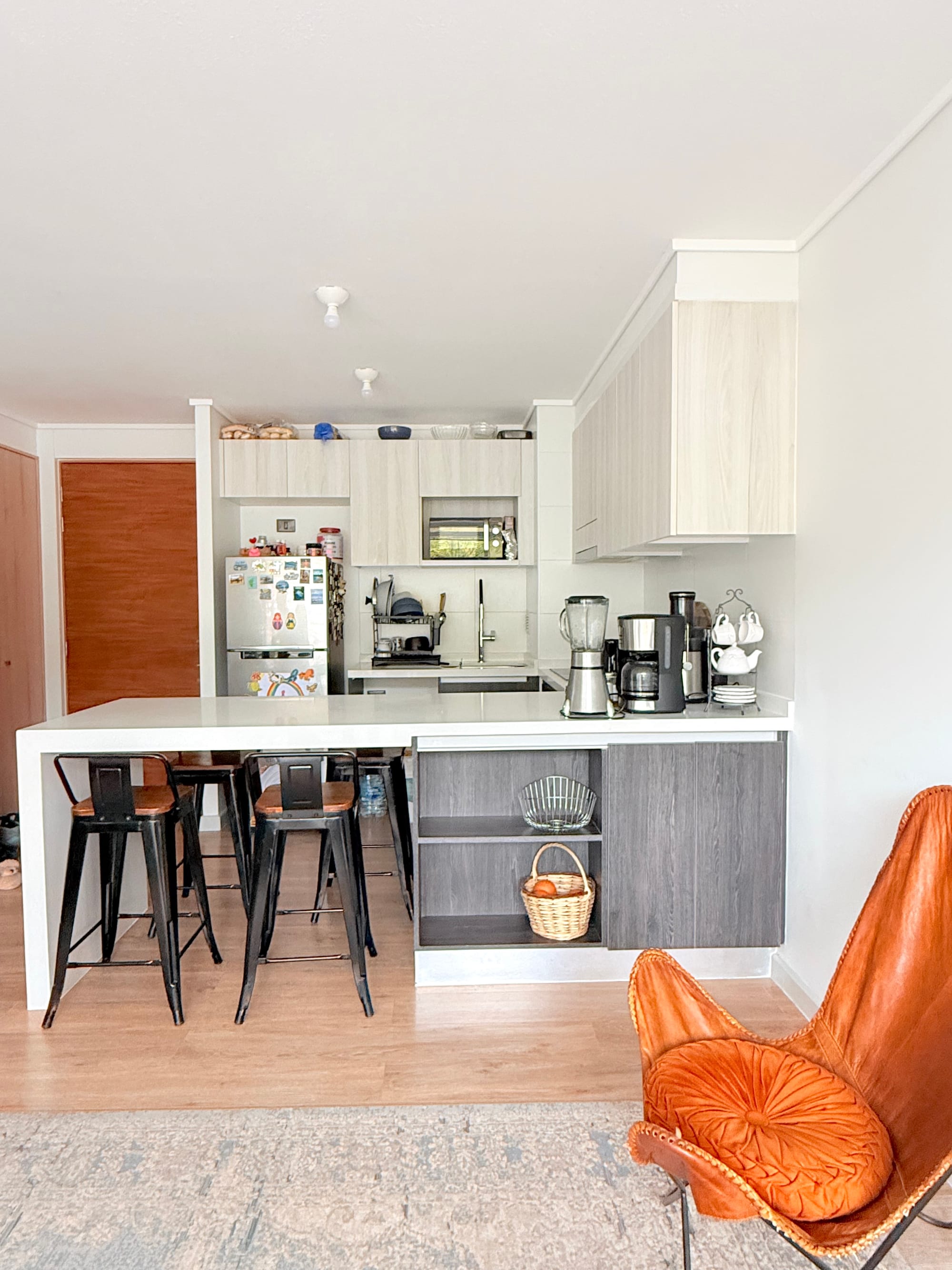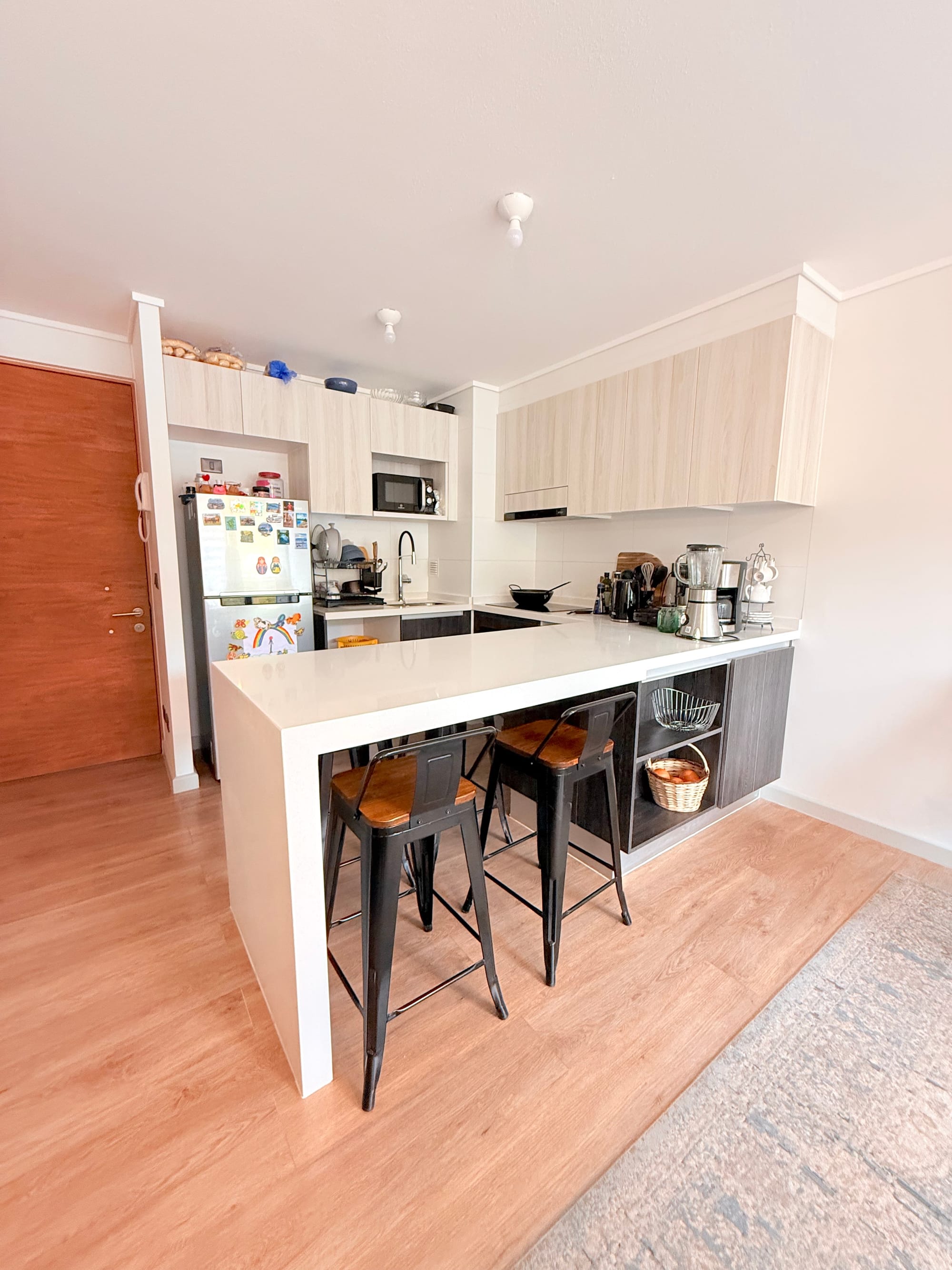 - El departamento cuenta con un living con cocina integrado. La cocina es muy moderna, full electric con encimera, horno y campana incluidos.