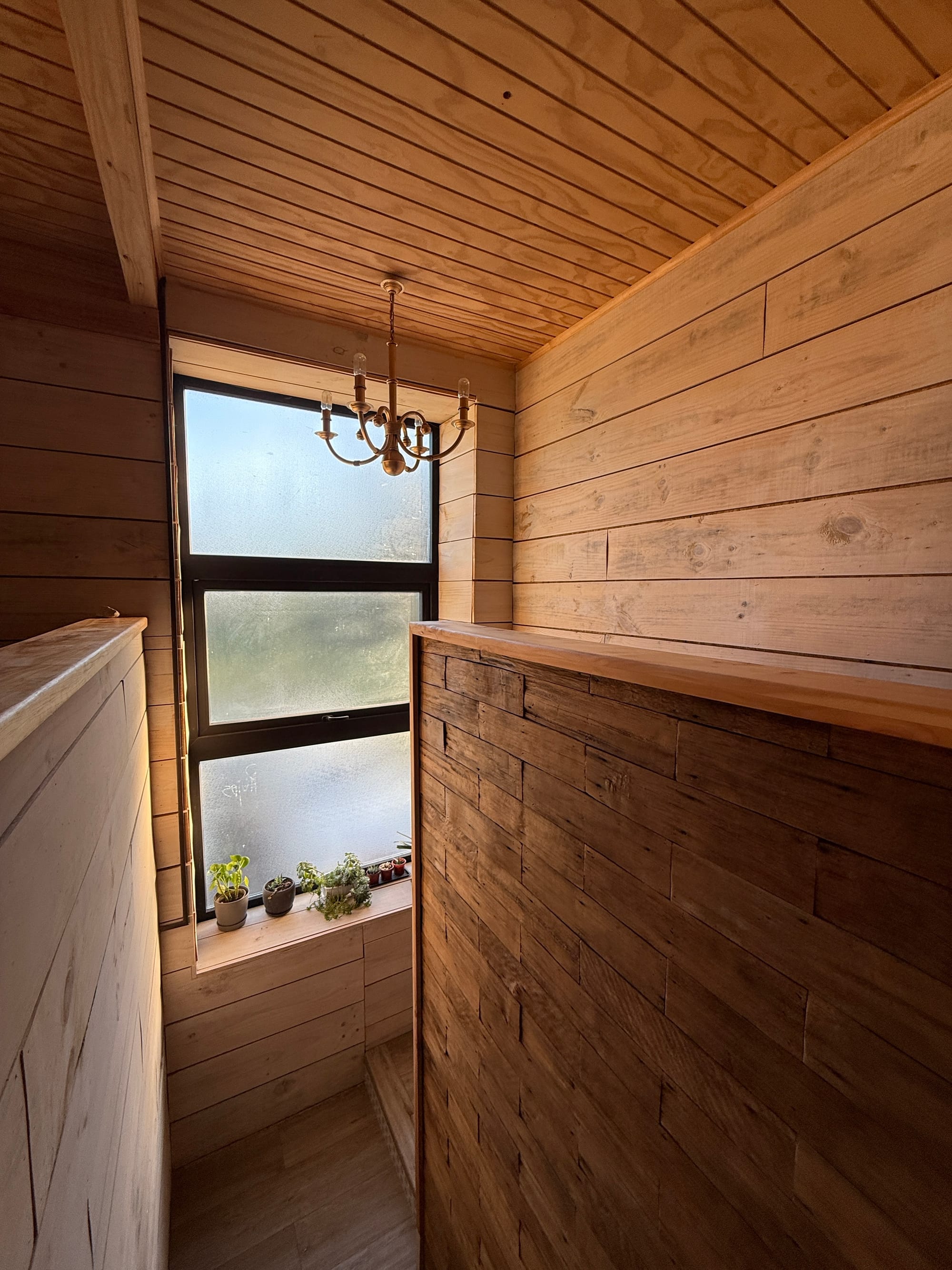 Decidimos conservar las vigas y los pilares, el techo era de tejuelas y no lo pudimos rescatar, era carísimo hacerlo pero todas esas tejuelas las aprovechamos para hacer recubrimientos en el interior y el exterior de la casa, de hecho, todavía tenemos muchas cosas en las que trabajar.